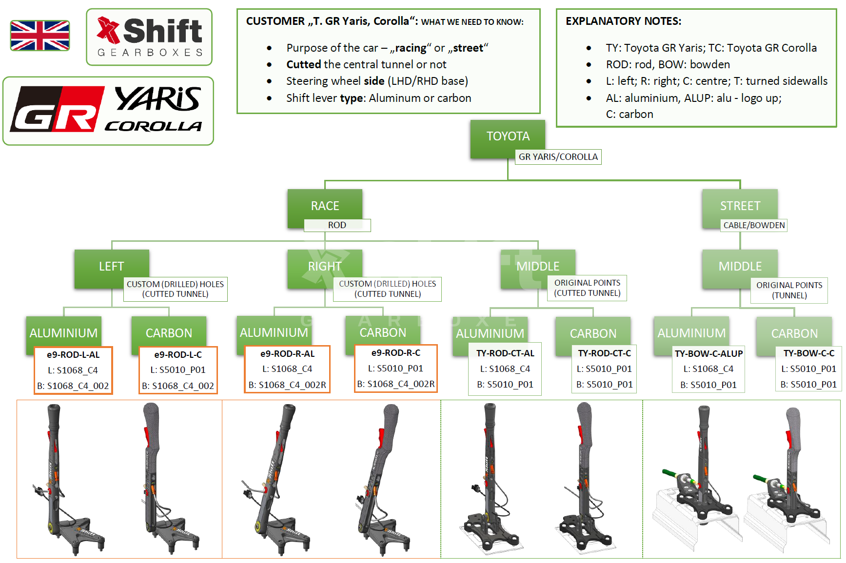 There are various types of levers available in our portfolio. Depending on the use of your car on the streets with occasional track driving or race specials, you can choose from several configurations or you can choose only some parts of “package".